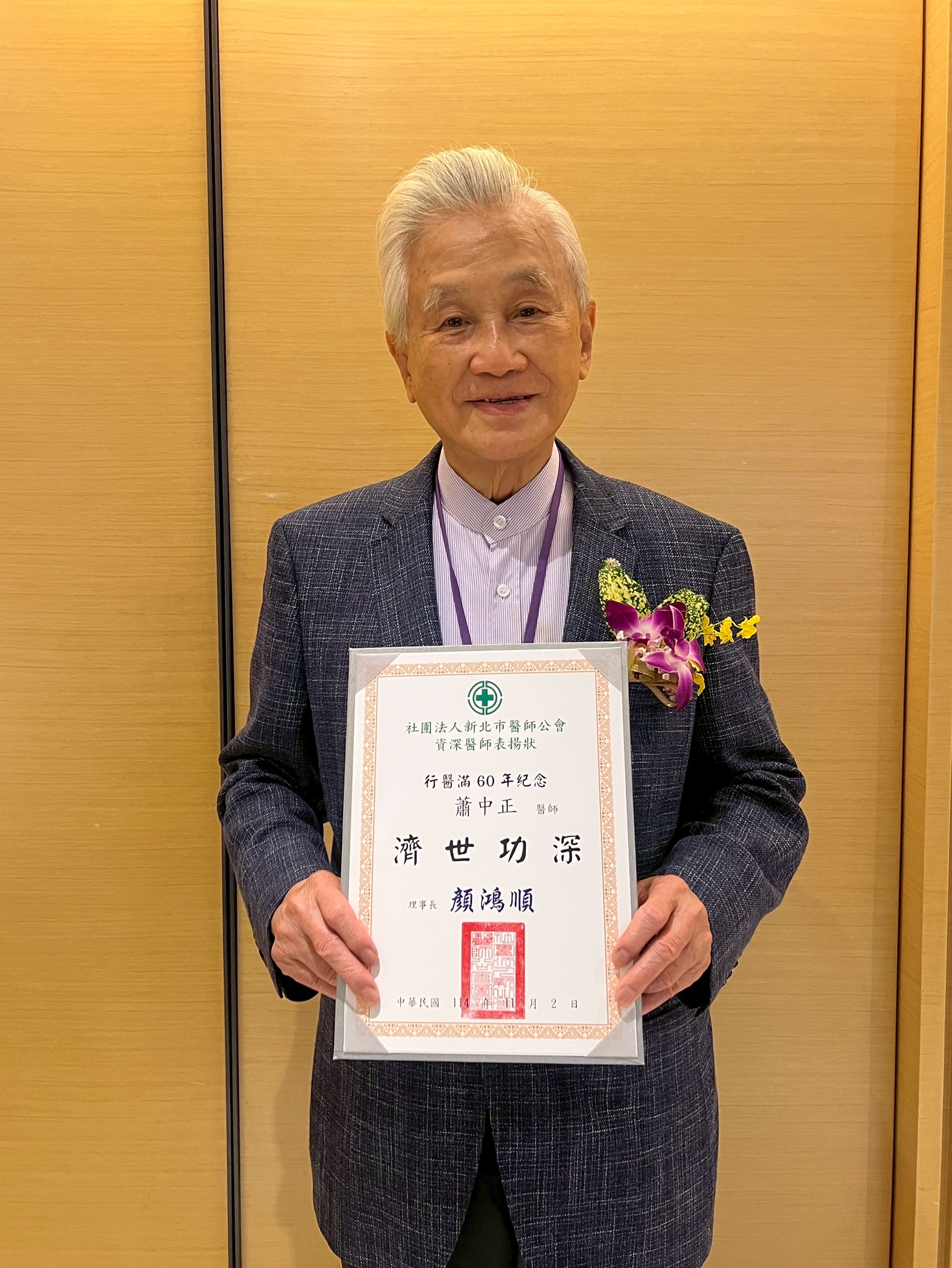 恭賀本院蕭中正院長榮獲 新北市醫師公會「行醫滿六十週年」表揚!