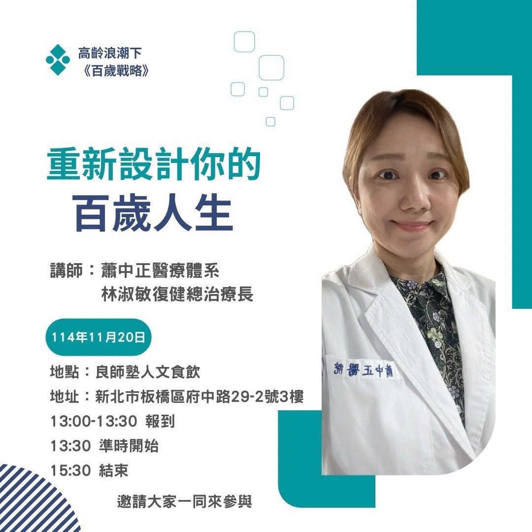 很榮幸! 蕭中正醫療體系接獲南山人壽邀請 林淑敏總治療長 授課主題: 「重新設計你的百歲人生」。