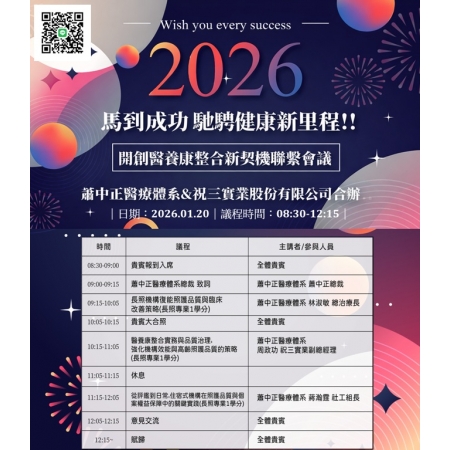 由蕭中正醫療體系攜手祝三實業股份有限公司共同主辦之「2026 馬到成功・開創醫養康整合新契機機構聯繫會議」,於今日順利舉行並圓滿落幕。本次會議廣邀各地長照機構負責人、專業主管及策略聯盟夥伴共襄盛舉,齊聚一堂,針對醫療與長照資源整合、照護品質提升及跨體系合作模式進行深入交流與探討。