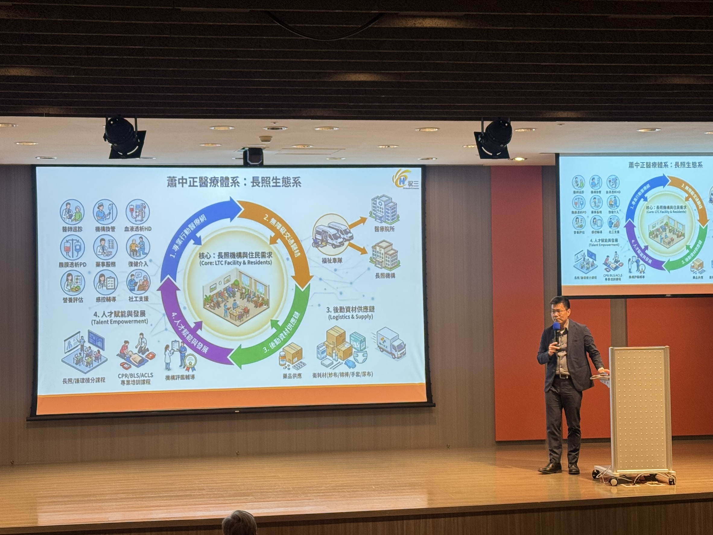 會議由蕭中正醫療體系總裁蕭中正致詞揭開序幕,說明醫養康整合在高齡社會中的關鍵角色,並強調建立穩定合作網絡對提升長照服務品質的重要性。議程內容涵蓋長照機構復能照護品質與臨床改善策略、醫養康整合實務與品質治理,以及住宿式機構於評鑑制度與日常照護中落實個案權益保障的實務經驗分享,協助機構將政策規範轉化為可落實於現場的具體作法。